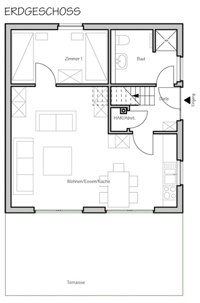 - 1 Schlafzimmer (zwei Betten je 2x1m)